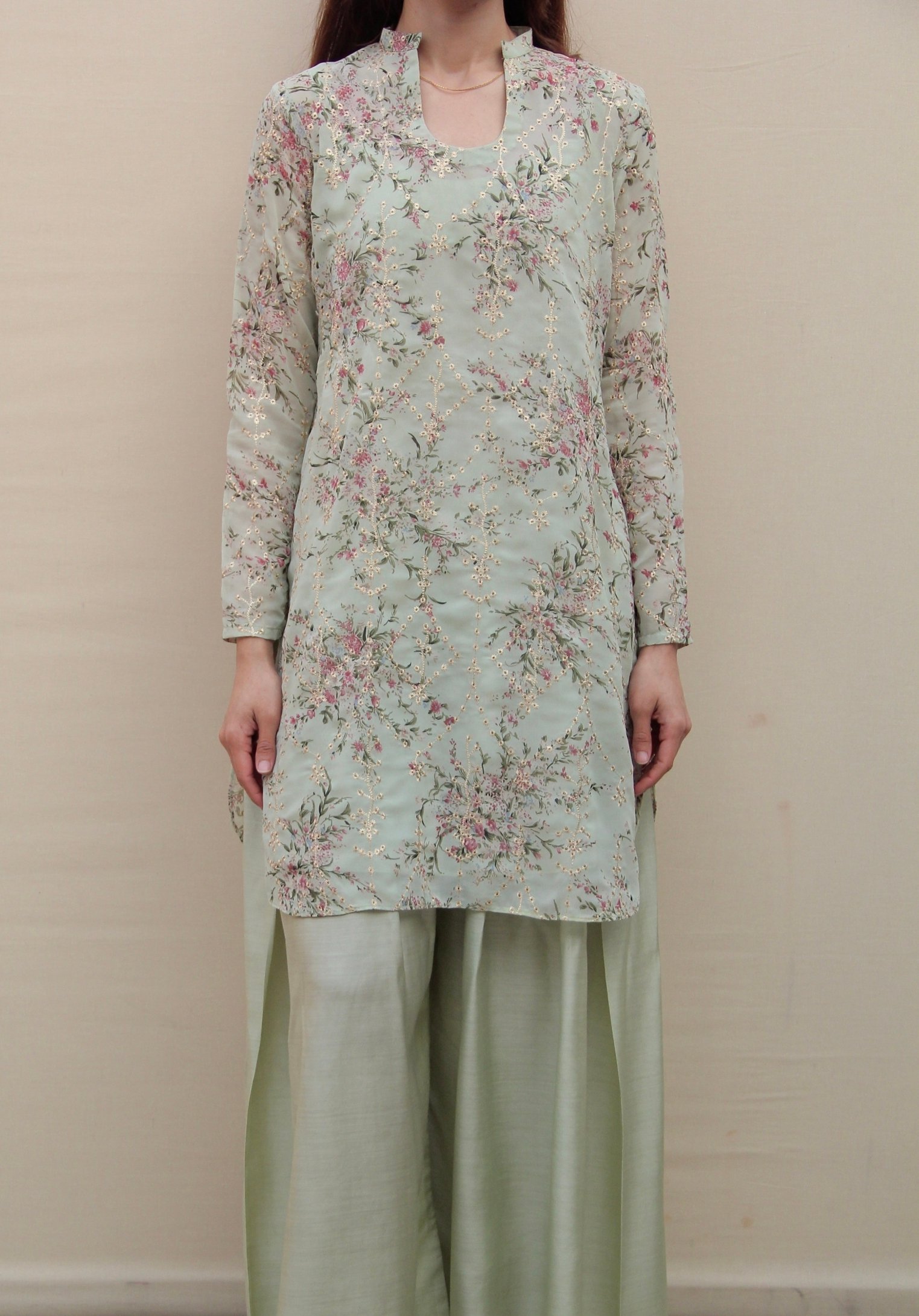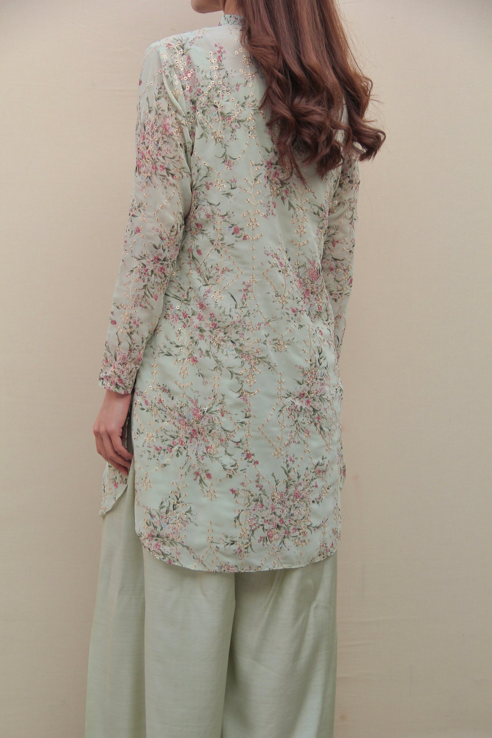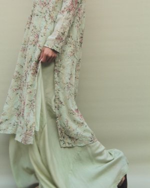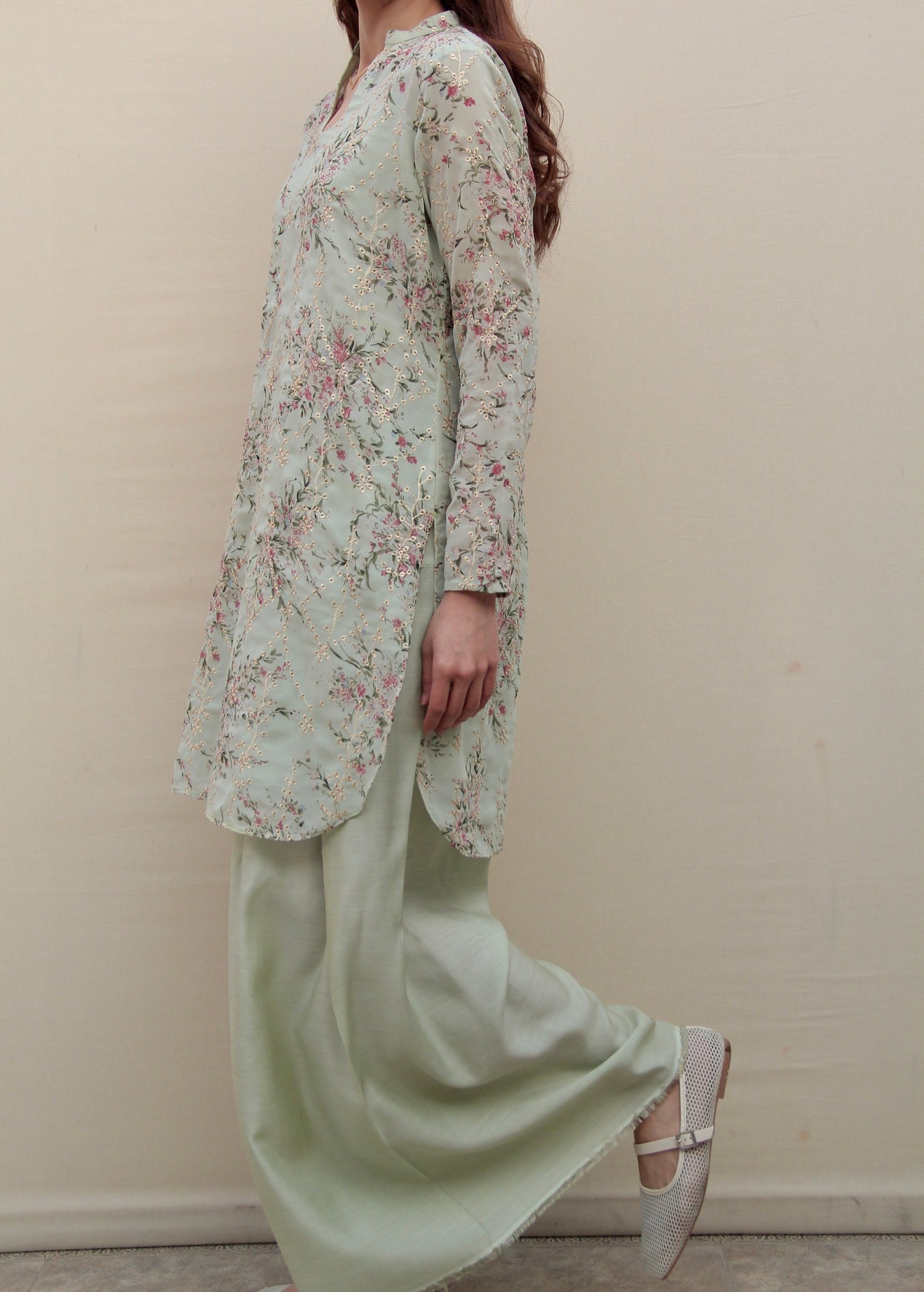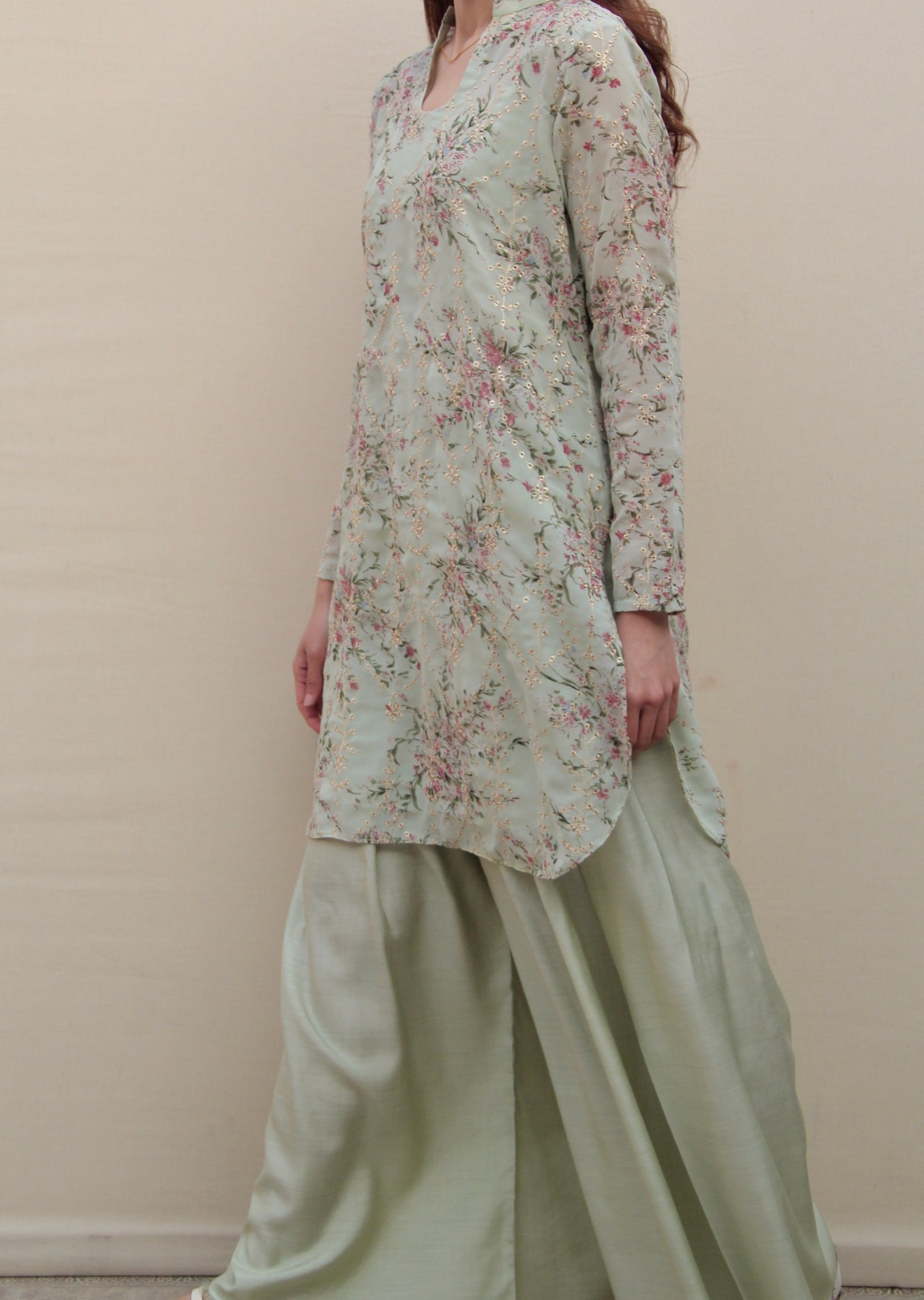 Part of Asian Cinema Archive, A Spring Frame draws from the imagery of blossom trees and springtime landscapes often seen across Asian cinema. Crafted in printed chiffon georgette, the design features a blossom-inspired floral print in a soft mint and pink palette, finished with fine gold open embroidery. Designed in Genre’s staple silhouette, this three-piece ensemble includes a sleek short shirt, dyed pants that are a blend between a traditional shalwar and a wide-leg trouser, and a double-layered undershirt to prevent any sheerness. Light, fluid, and considered, it is intended for quiet festive moments.