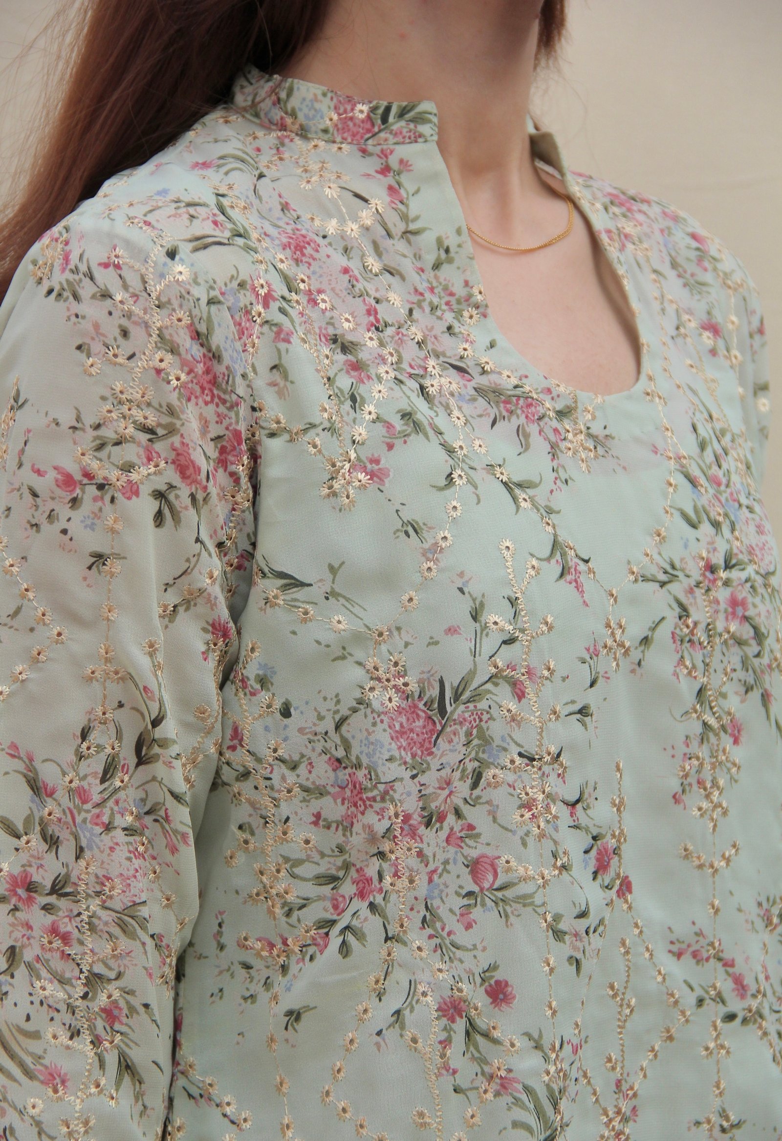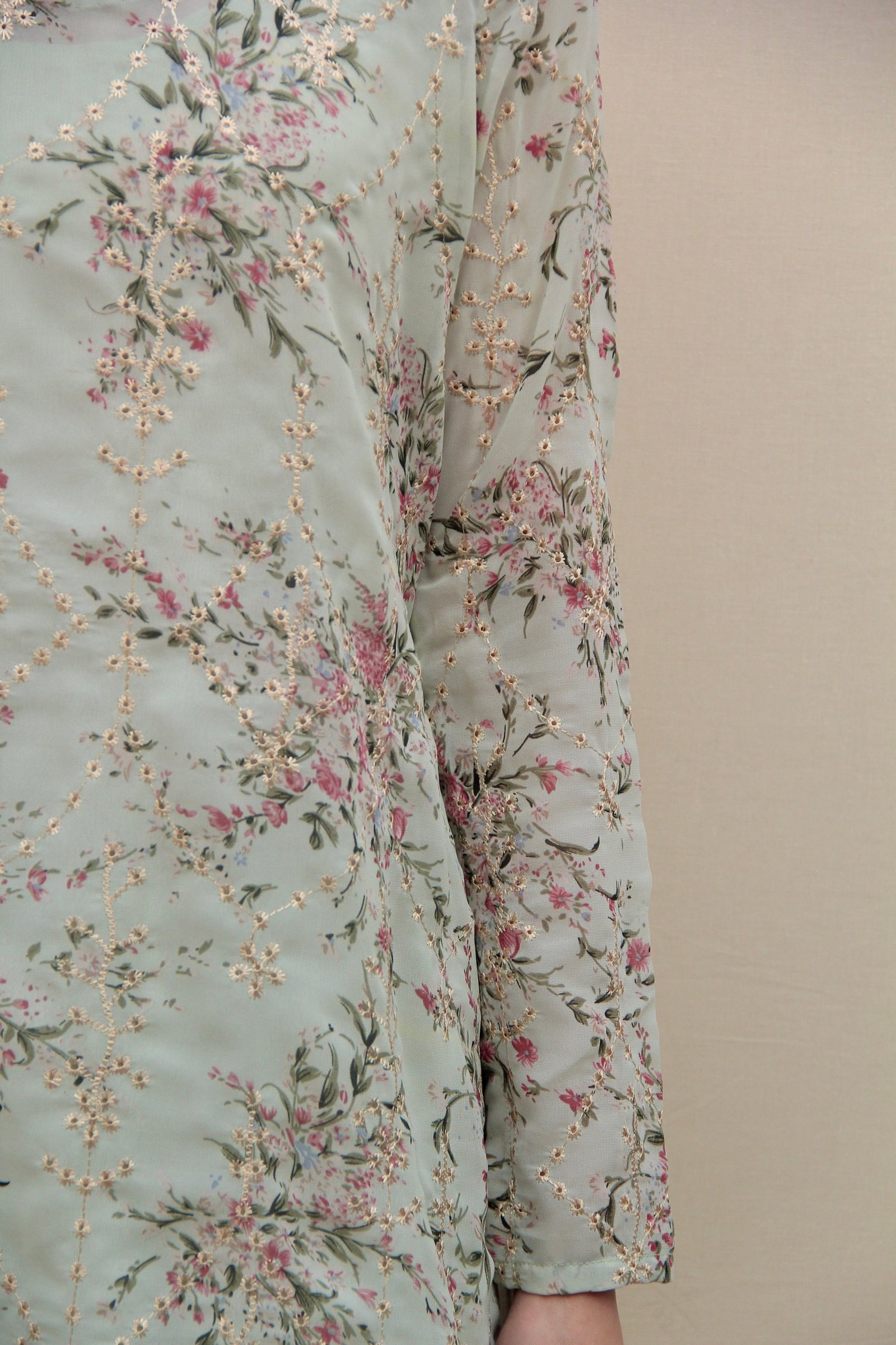 Fabric: Chiffon Georgette (a lighter, finer version of georgette with a softer drape and increased airiness) with gold open embroidery.