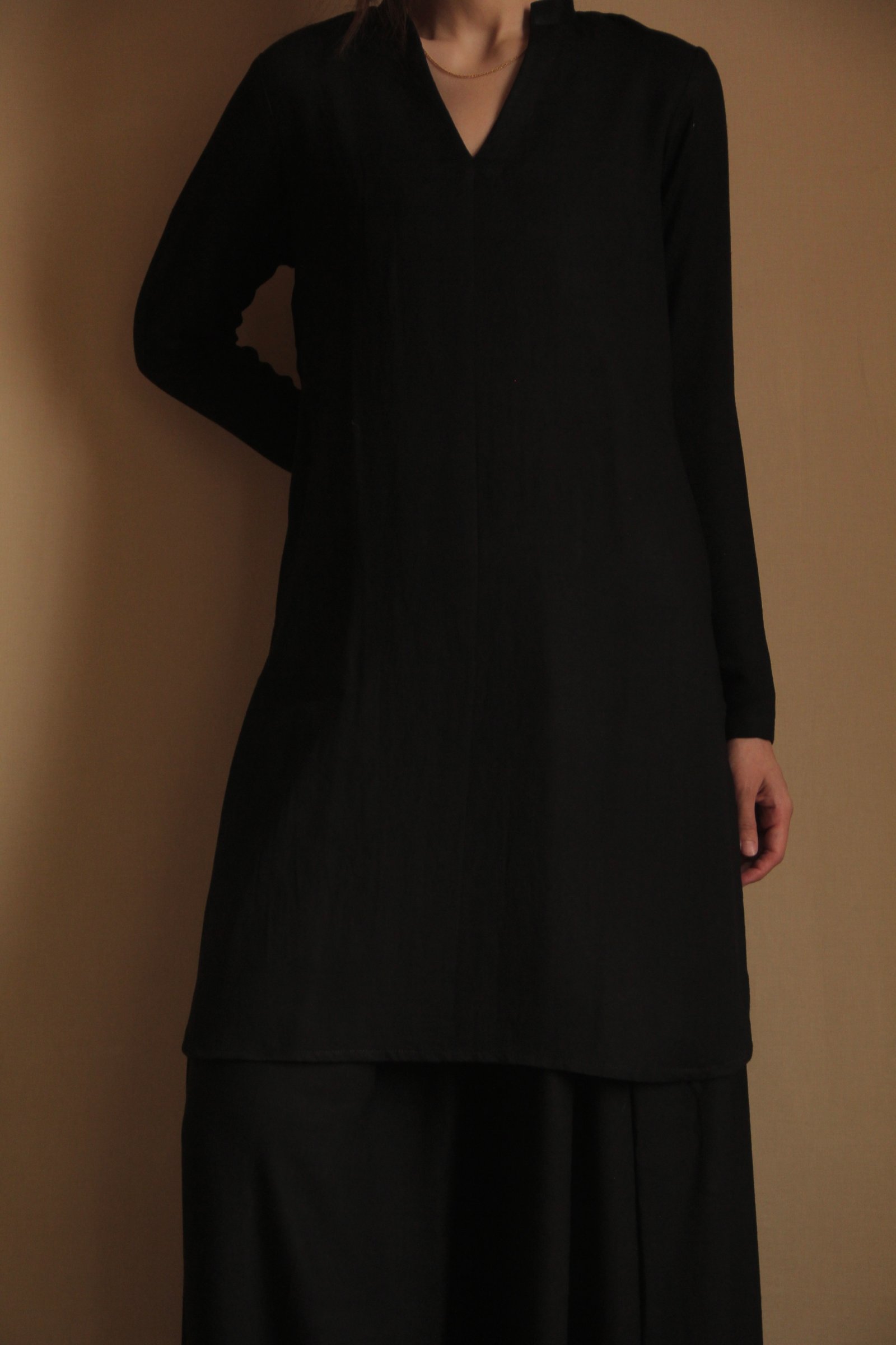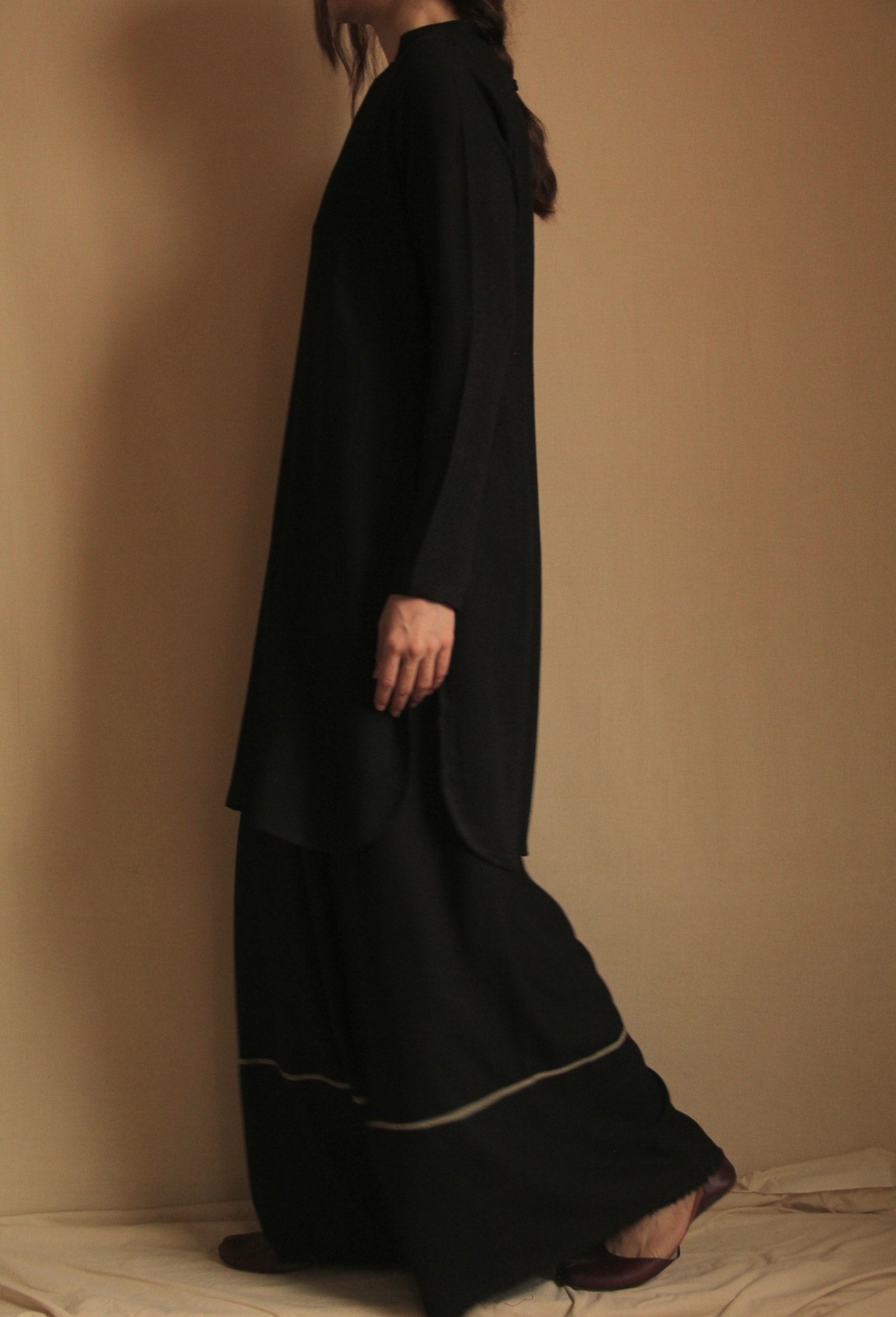 An effortless blend of structure and flow, this all-black set features a sleek, short ban-collar shirt with a refined silhouette. Crafted from weighted fabric, it drapes elegantly for a sophisticated yet minimal look. The wide-leg shalwar-trouser hybrid with hand-work on the hem adds a unique touch and colour contrast – offering, movement, comfort and framing.