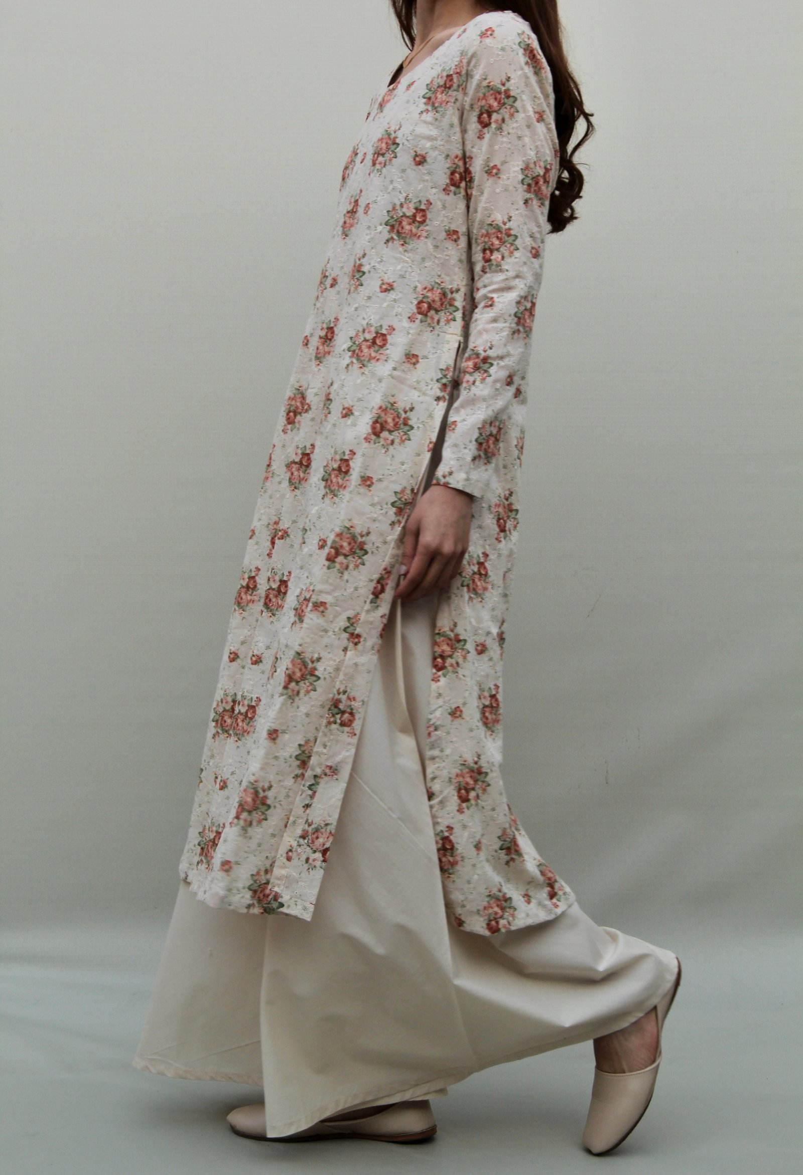 Made from embroidered lawn fabric, this printed ensemble features a long, A-line shirt paired with a wide-legged trouser for maximum comfort and breathability, and a sleek silhouette. Lightweight, relaxed, and functional during warm days.