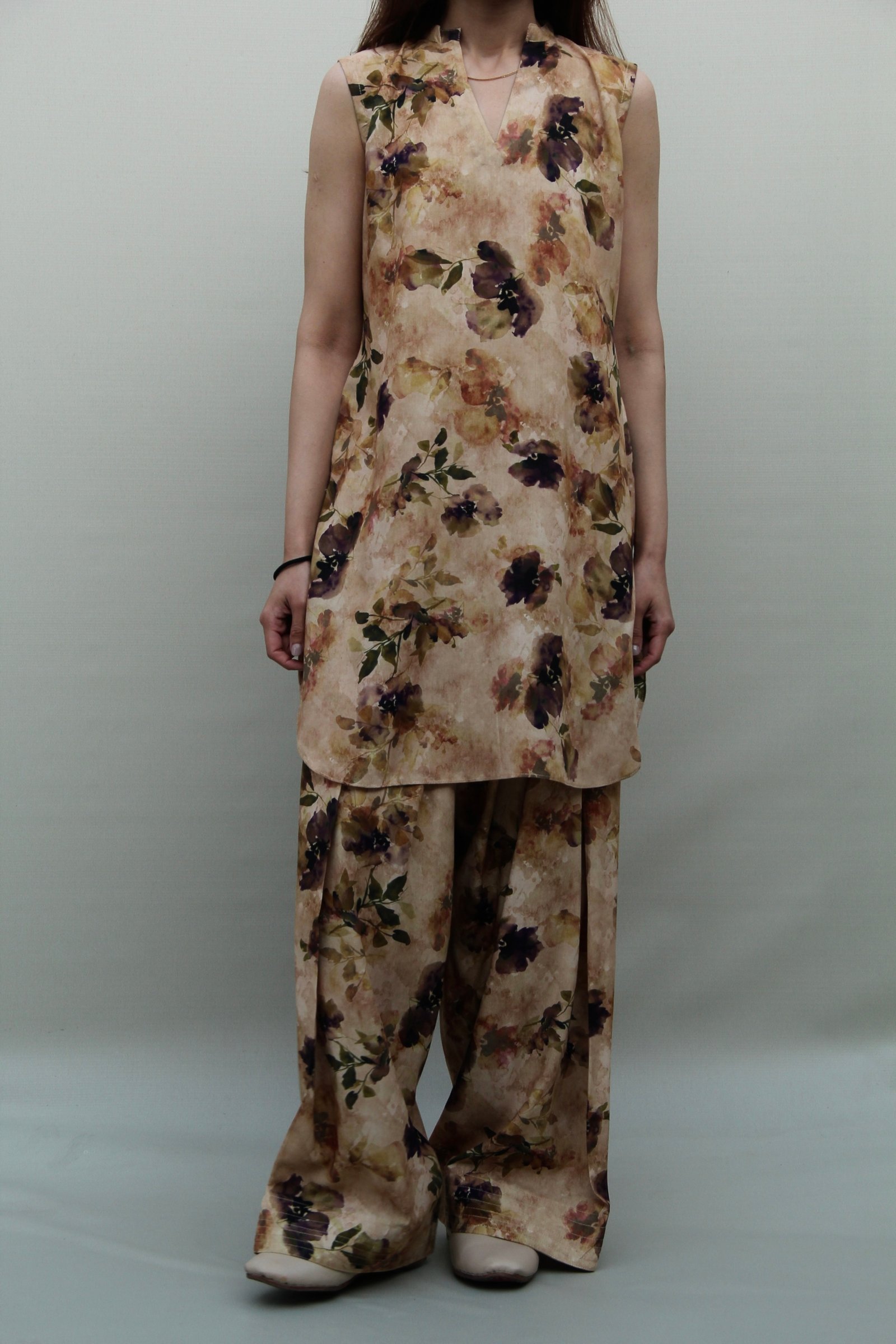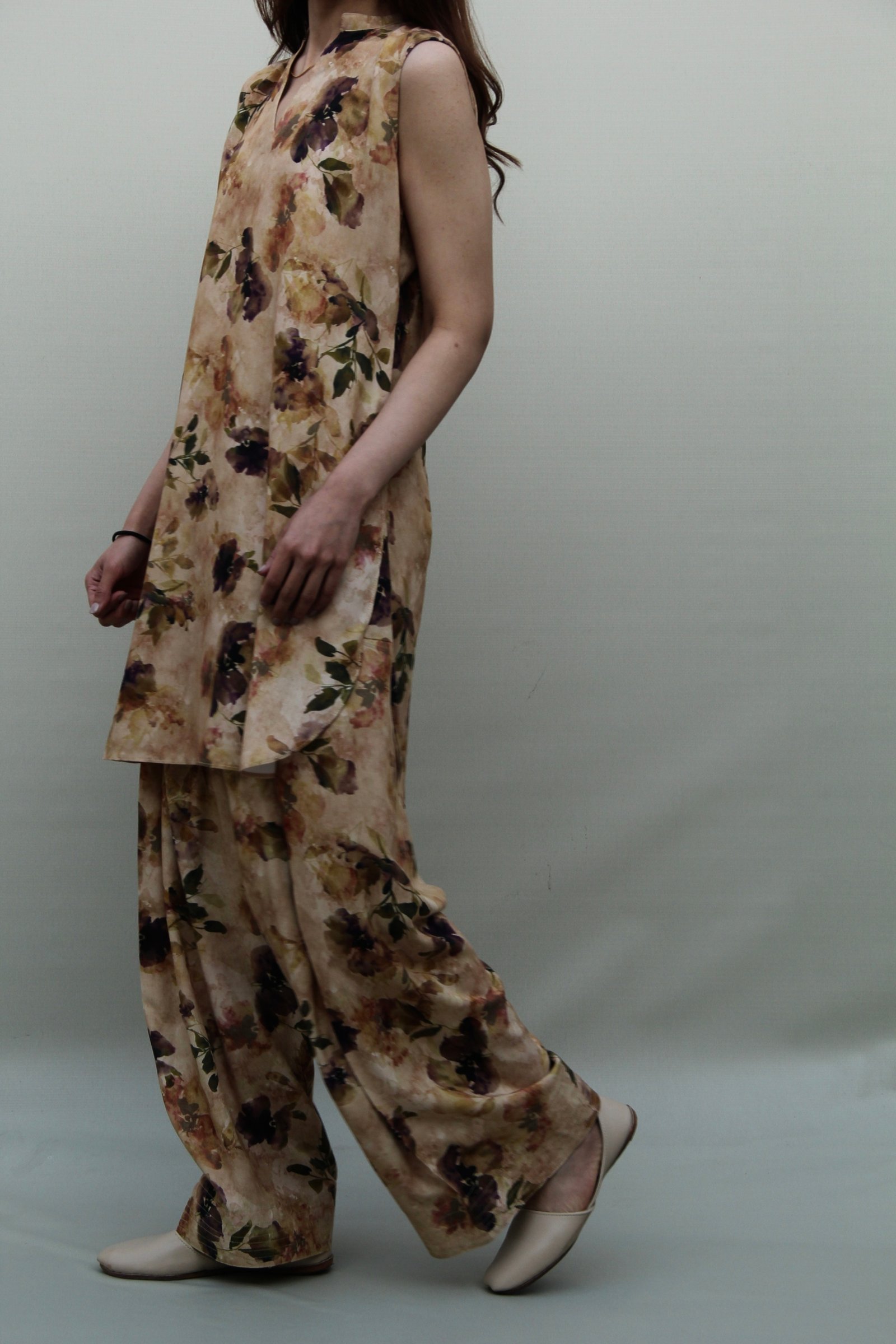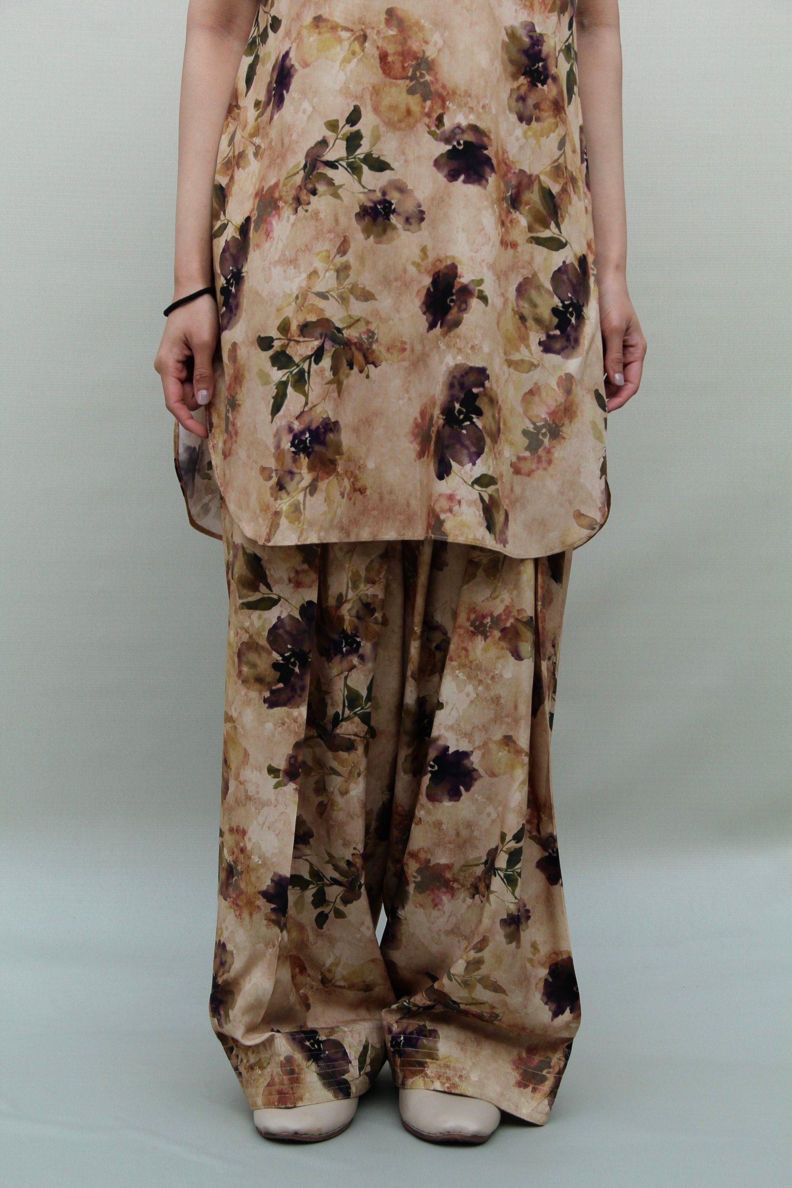 A two-piece printed set crafted in suede linen for summer. The silhouette features a relaxed shirt paired with wide, loose paincha shalwar that falls with ease. An overall light and effortless article designed for laid-back days that still manages to stand out on its own. Stitched, unattached sleeves are included in the package.