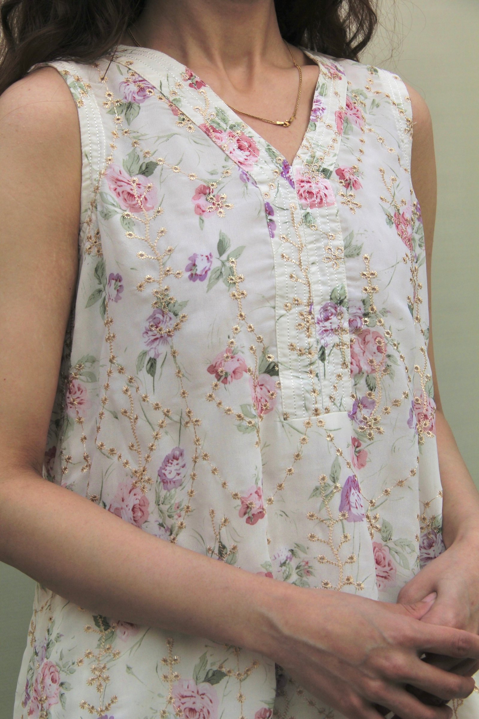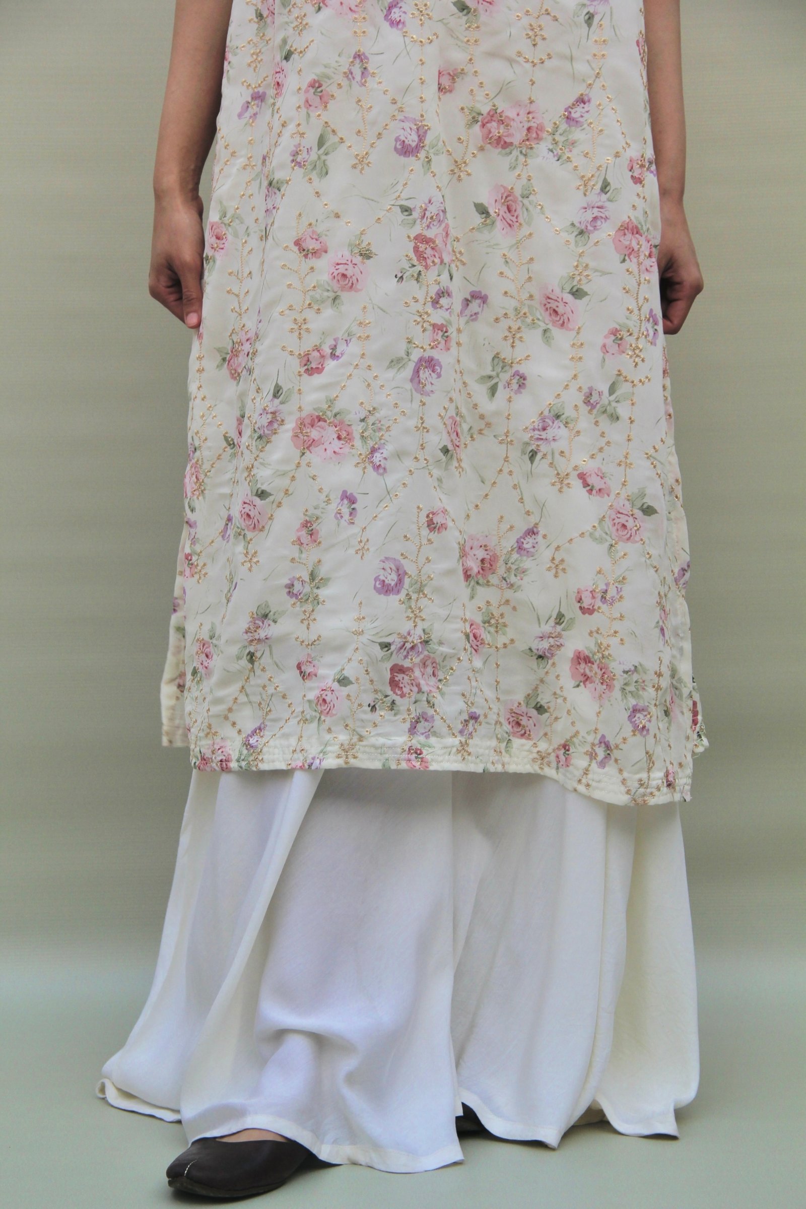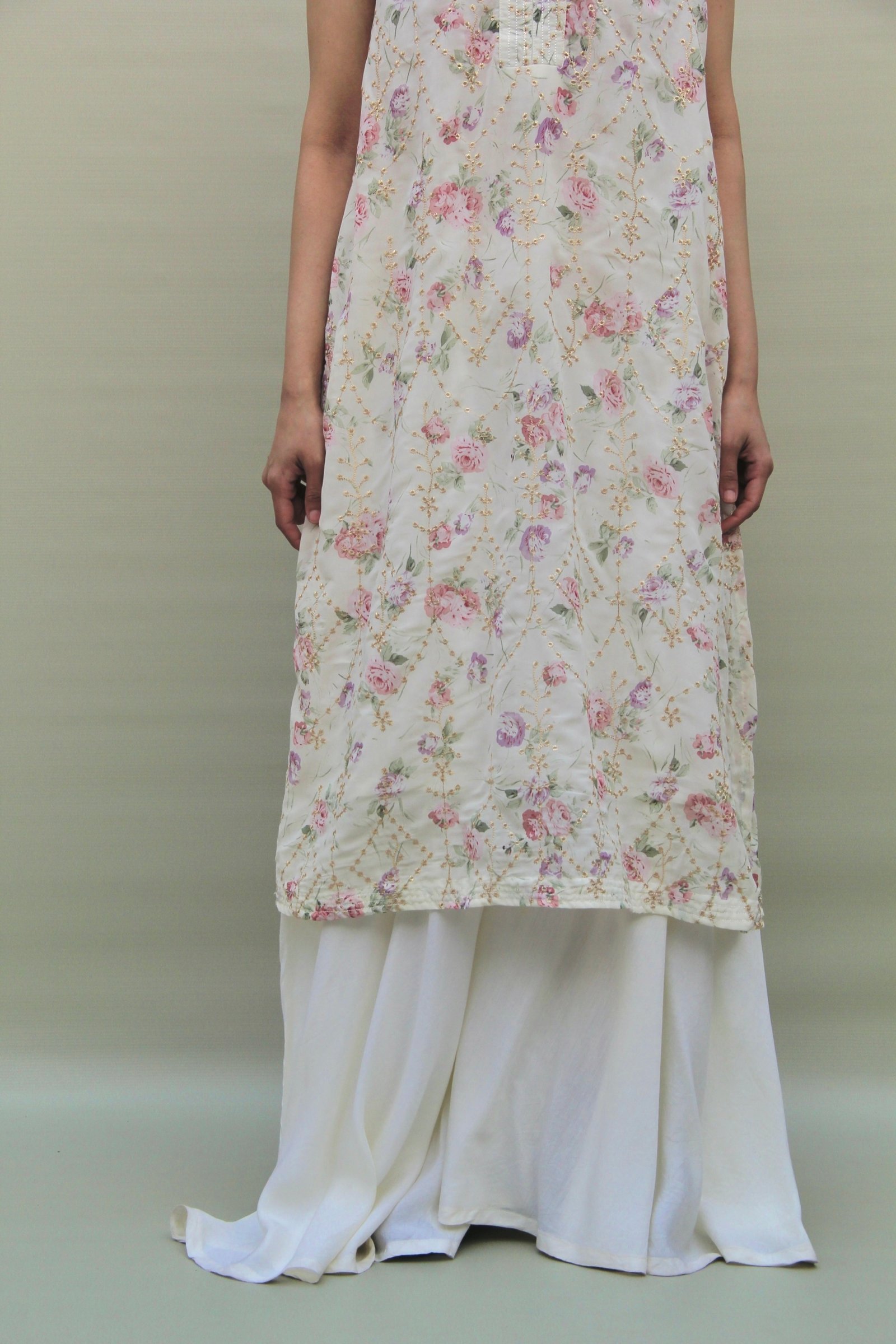 This two-piece ensemble features a long, A-line shirt in chiffon georgette, finished with a delicate floral embroidered print that softens the ivory base. The sleeveless shirt comes with a built-in undershirt for a clean, fluid fall. . The look is completed with sharara-style pants, cut for flow and comfort, allowing the fabric to move gently with every step. Light, breathable, and quietly festive, this piece balances structure with softness, making it ideal for long Eid days and evening gatherings alike.