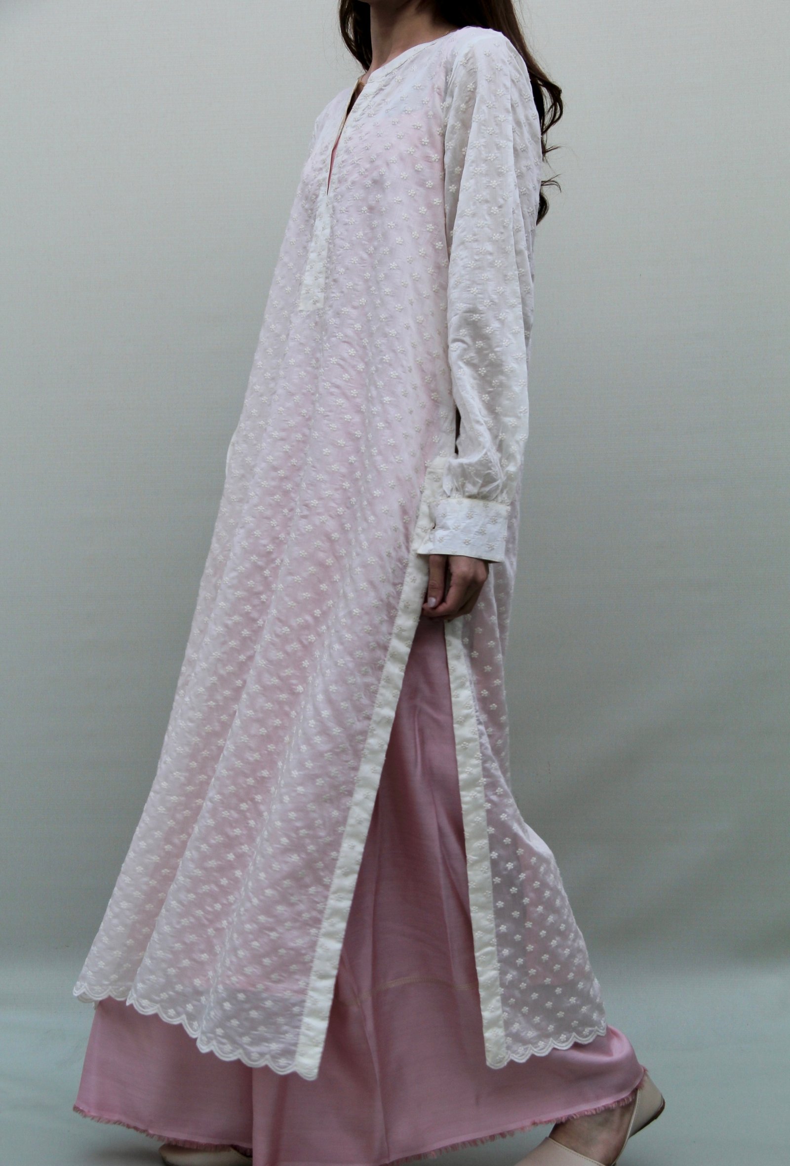 A long ivory kurta crafted in textured paper silk lawn, a festive fabric that carries a soft sheen and light structure. The silhouette is slightly loose yet thoughtfully shaped, creating a form that feels both relaxed and composed. Designed to be worn up or down, the sheer kurta invites layering and can be paired with any undershirt or styled in multiple ways depending on the occasion.