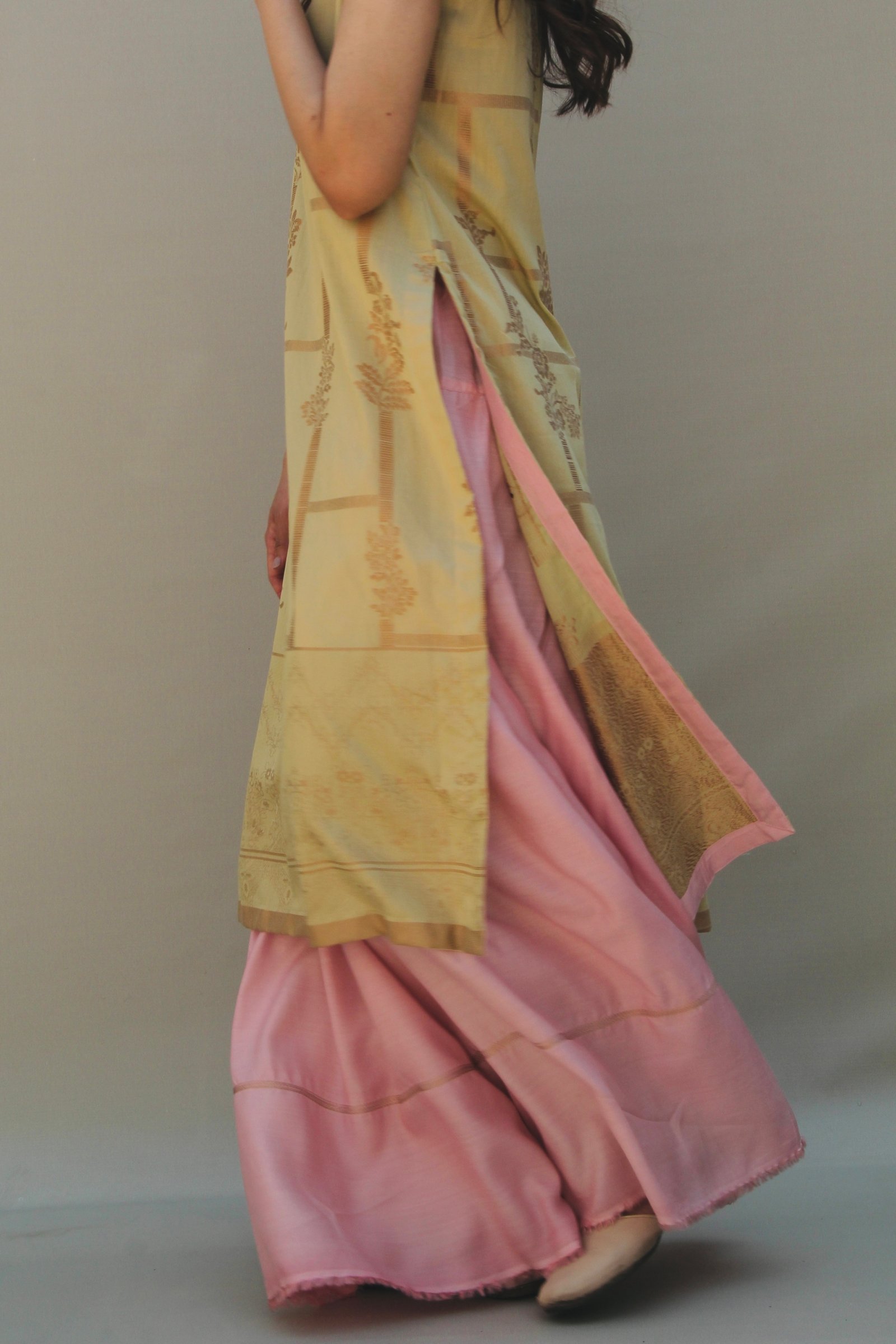 Pink pleated pants crafted in silk viscose, featuring delicate embroidery at the hem that adds subtle dimension to the silhouette. Designed with a fluid silhouette that blends the ease of a shalwar with the structure of a wide trouser, making them easy to pair up or down with a variety of short or long tops.