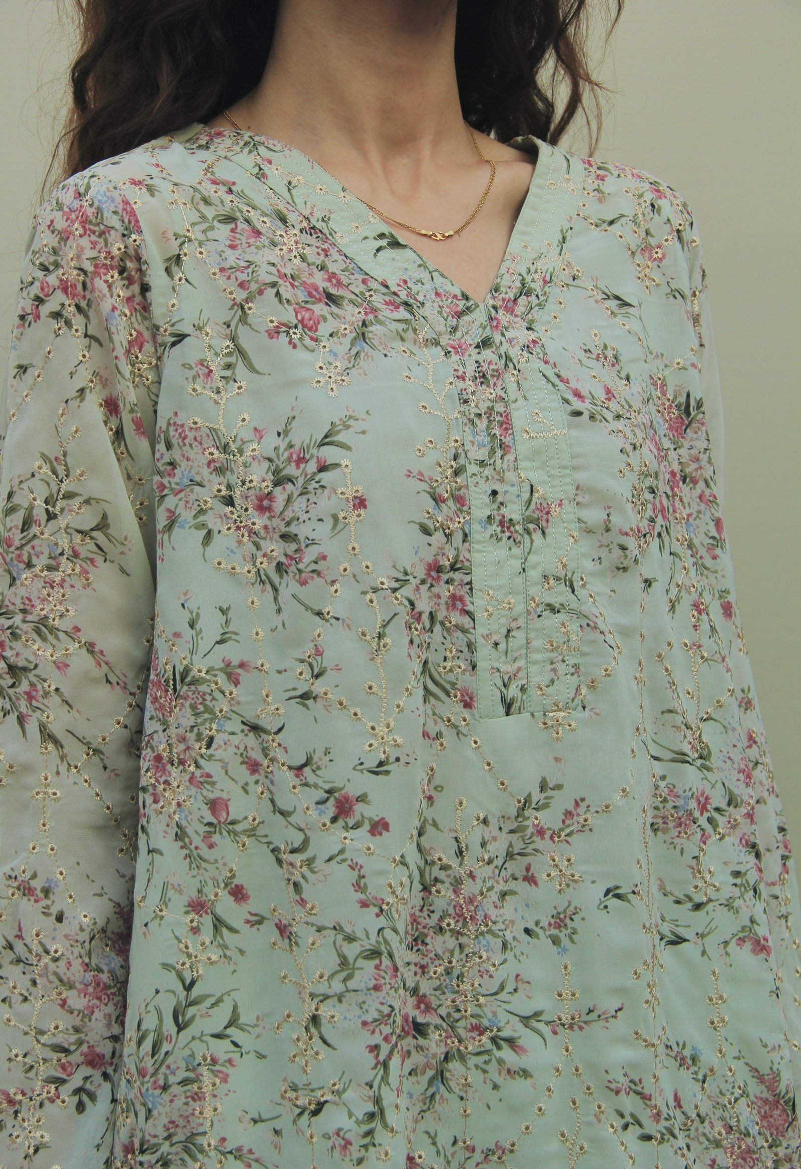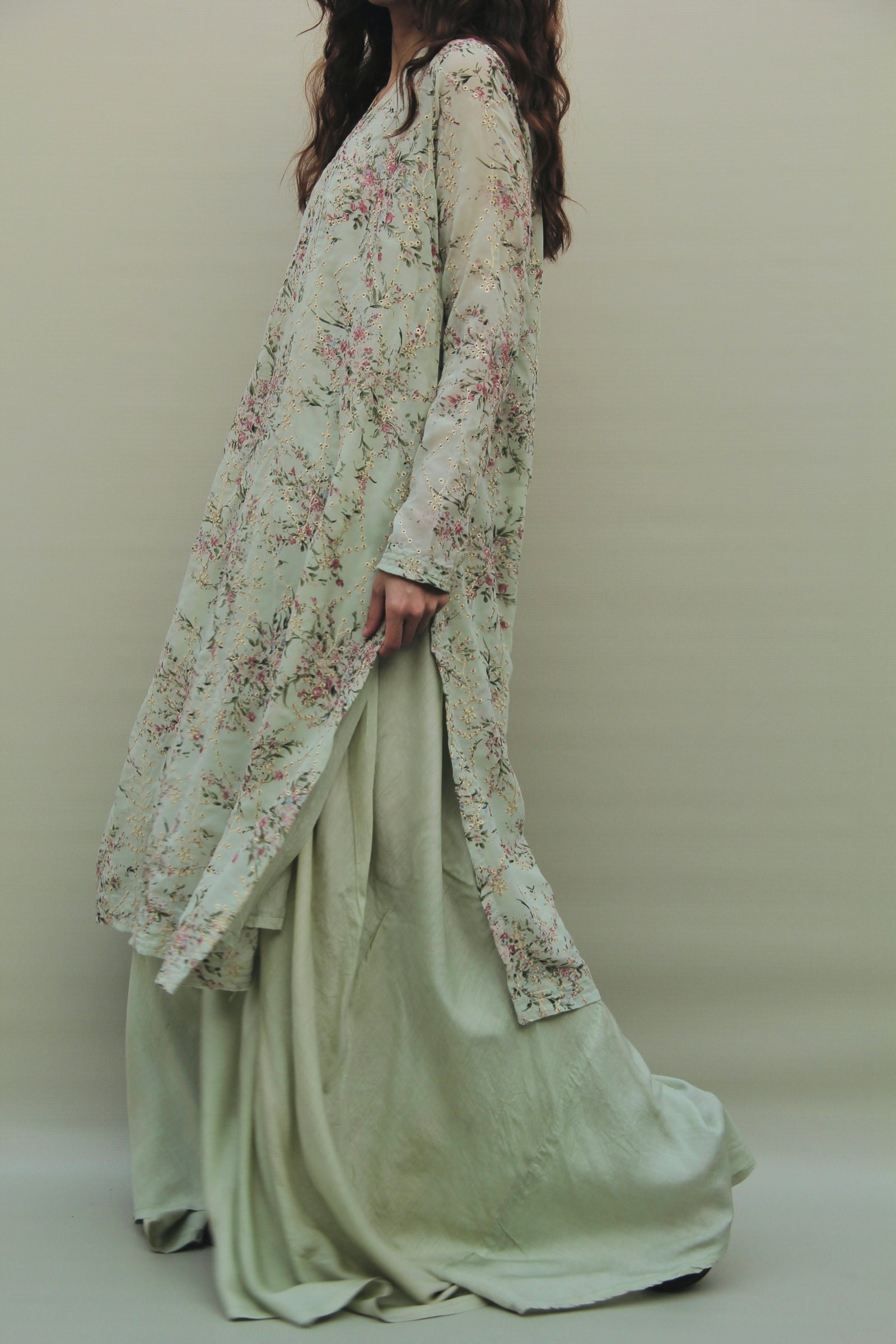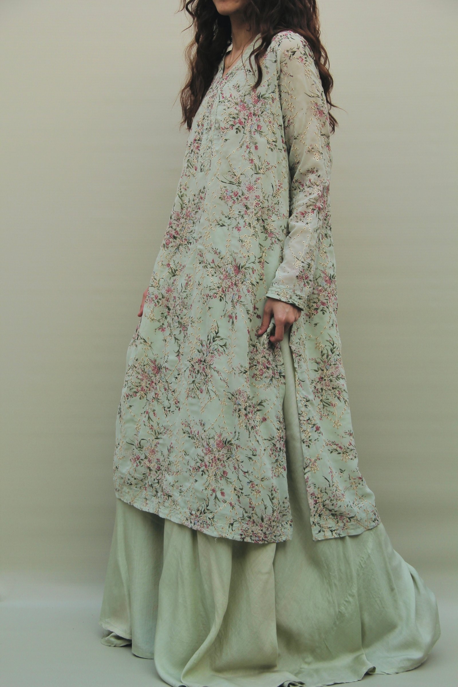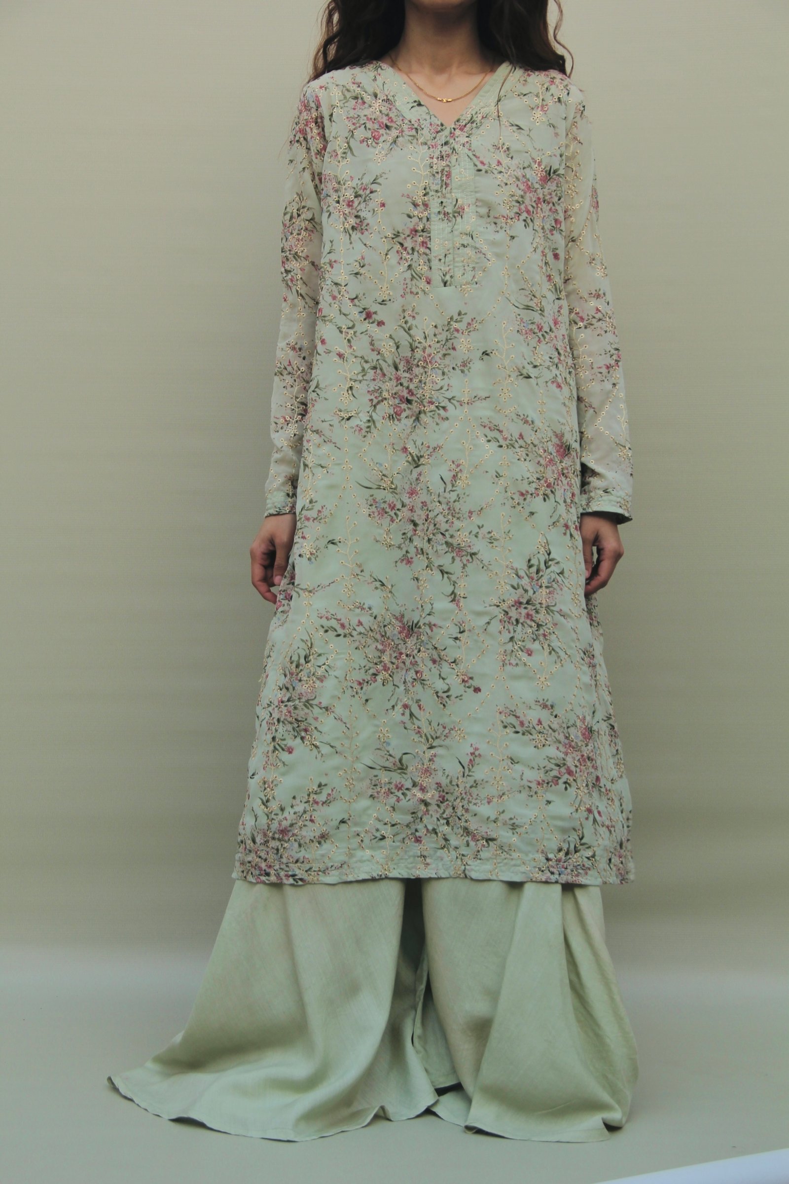 This two-piece, full-sleeve ensemble is crafted in fluid silk viscose, featuring a long A-line shirt adorned with a delicate floral embroidered print that blends seamlessly into the fabric. Designed with a built-in undershirt, the silhouette remains clean and effortless, while the sleeveless cut is complemented. Paired with flowing sharara pants, the ensemble moves with ease and lightness, creating a look that feels airy yet considered. Subtle in colour and refined in detail, this piece is designed for understated Eid moments and quiet celebrations.